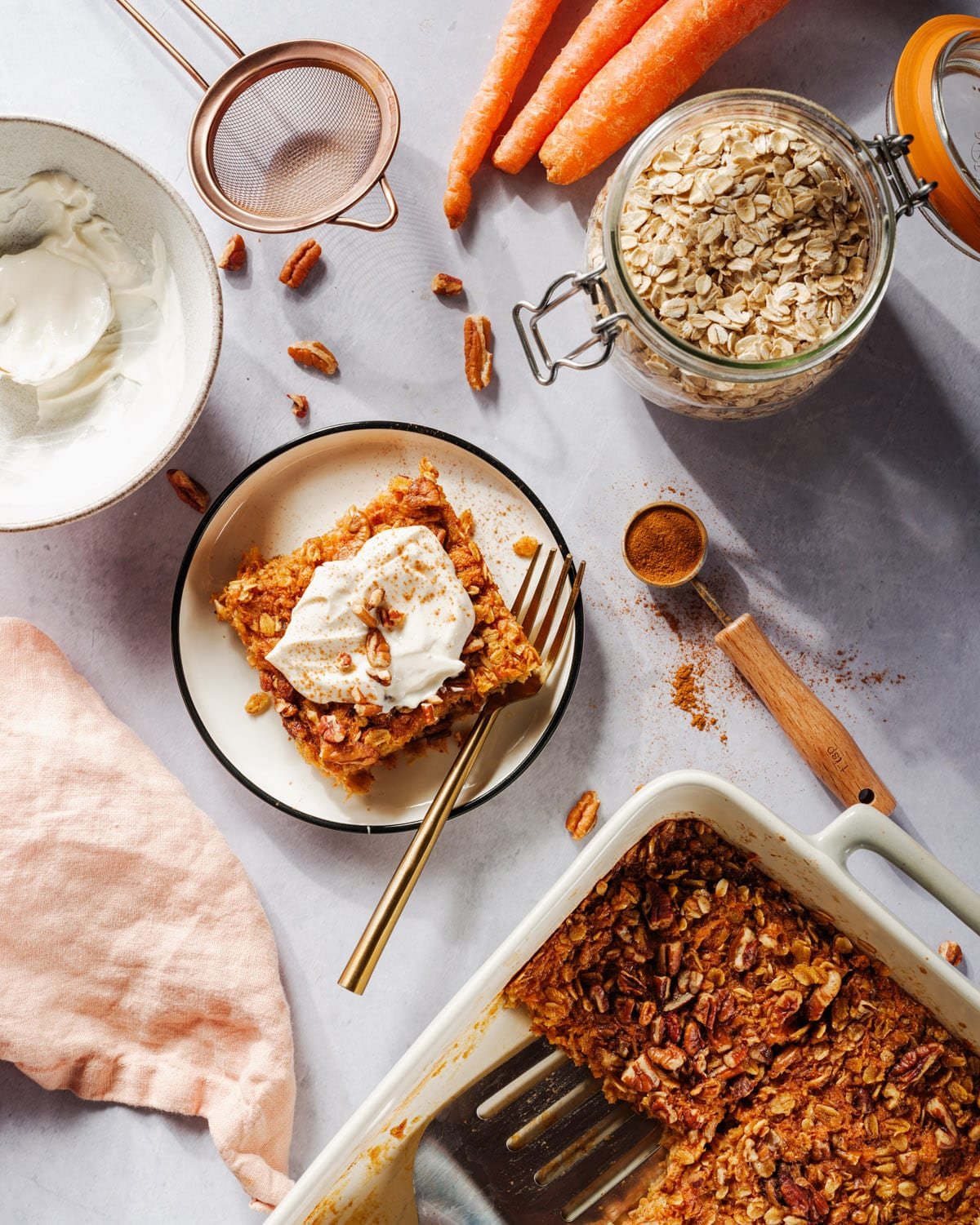 يمكن للطبقة الصحيحة أن تأخذ دقيق الشوفان المخبوز بكعكة الجزر إلى المستوى التالي! مفضلتي هي "فروستينج" الزبادي اليوناني، ولكن هناك الكثير من الأفكار: