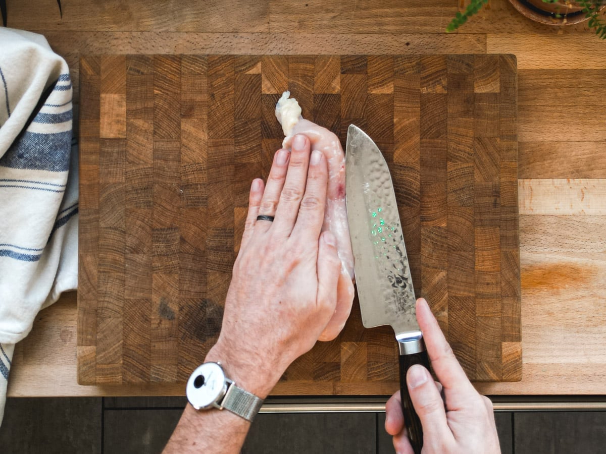 - افتحي صدر الدجاج، ثم قطعيه على طول الطية للفصل بين النصفين (كل نصف عبارة عن كستلاتة).