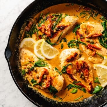 وصفة الدجاج التوسكانية الكريمية هذه هي عشاء الدجاج الذي تحلم به! يتم غسل الصدور اللذيذة في صلصة حالمة من الطماطم المجففة بالشمس والسبانخ والثوم والبارميزان. جاهزة خلال 30 دقيقة فقط، إنها فكرة عشاء سهلة ومثيرة للإعجاب في نفس الوقت!