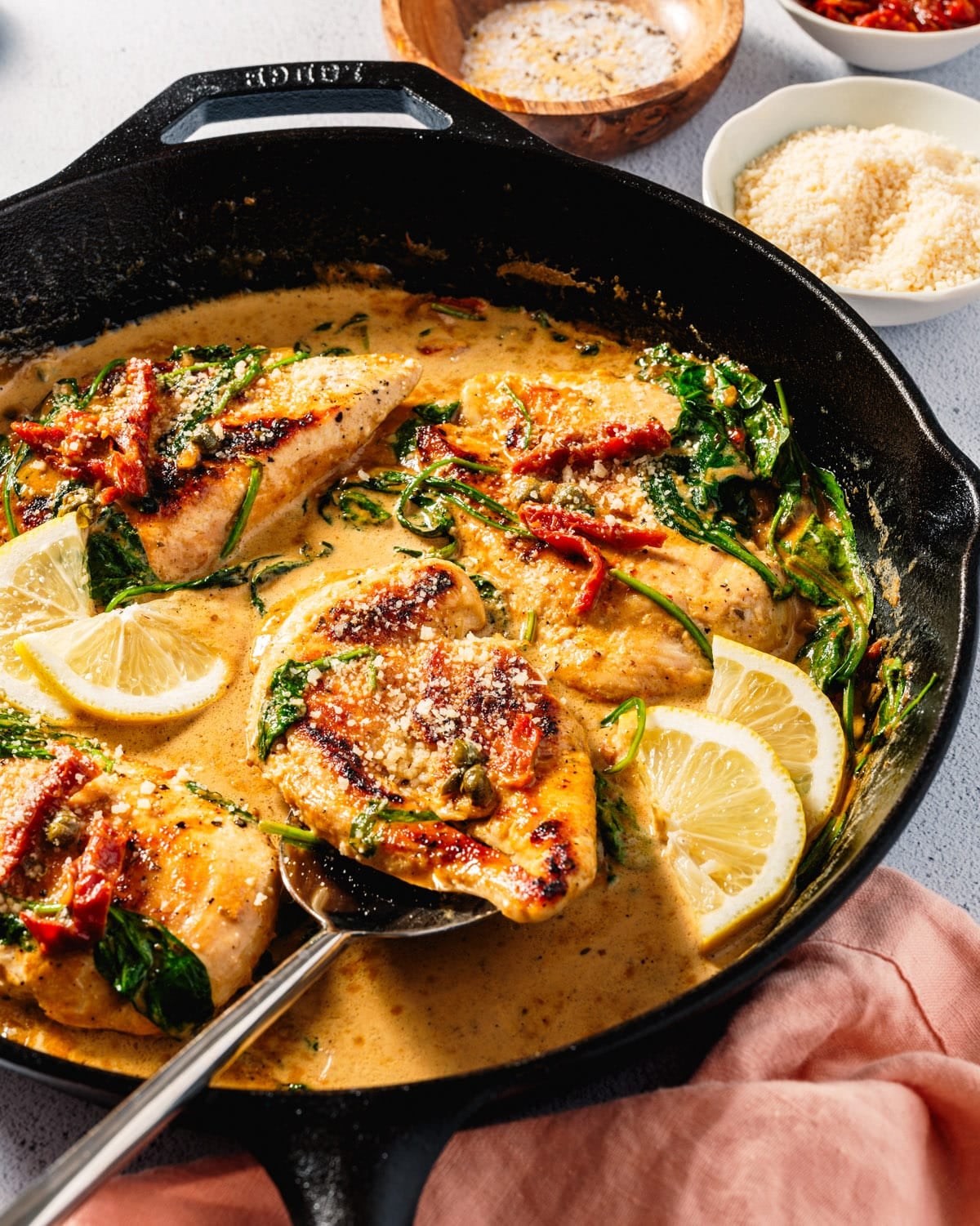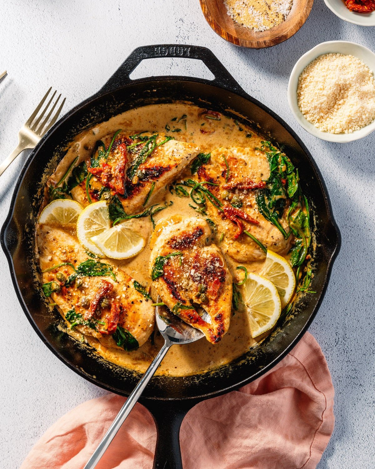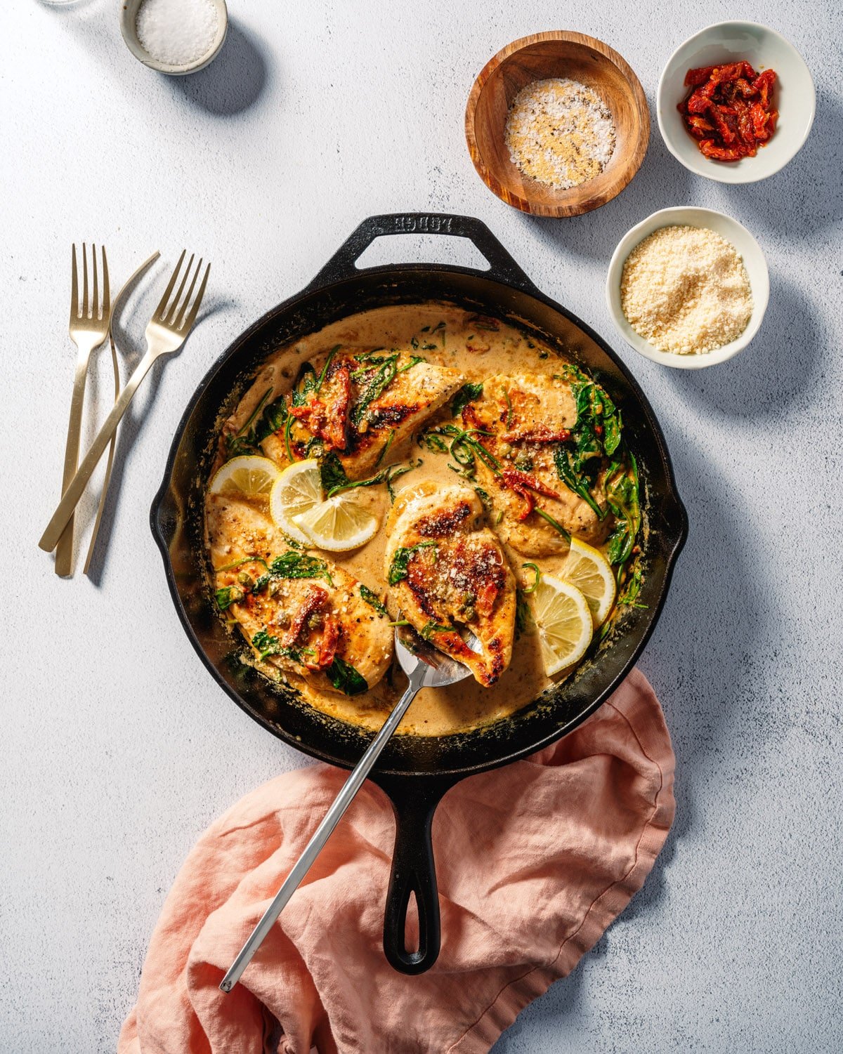 إذا تمكنا من تناول عشاء واحد فقط لبقية حياتنا، فقد يكون هذا العشاء: مقلاة من الدجاج التوسكاني الكريمي! ما الذي يجعلها جيدة بشكل شنيع؟ ربما هي الصلصة الحالمة المكونة من الطماطم المجففة بالشمس والسبانخ والثوم والبارميزان. أو ربما يكون انفجار النكهة اللذيذة من.