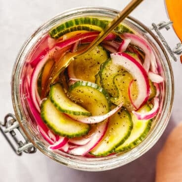 اصنعي الخيار والبصل المخلل المنعش مع هذه الوصفة السريعة لمخلل الثلاجة! إنها مقرمشة ولذيذة، وجاهزة في 30 دقيقة ومثالية للأطباق والسلطات والسندويشات.