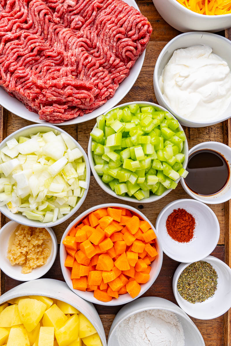 Cette soupe au bœuf et aux pommes de terre est un pur réconfort dans un bol ! C'est un plat très simple à base de bœuf haché accompagné de nombreux légumes, notamment : des oignons, du céleri, des carottes et des pommes de terre, assaisonnés d'ail, de paprika, d'herbes et de sauce Worcestershire. Le dernier élément est la crème sure et le cheddar qui fondent dans le bouillon ! Cette recette se prépare rapidement, ce qui en fait le repas parfait tous les soirs de la semaine, même les nuits de travail chargées !