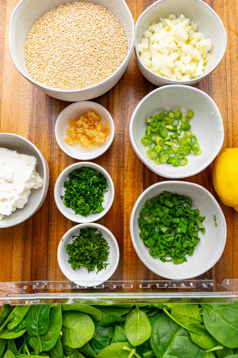 Ce plat est basé suravec le riz remplacé par du quinoa. La recette est aussi simple que de faire cuire un oignon avant d'ajouter le quinoa et le liquide et de laisser mijoter jusqu'à ce que le quinoa soit cuit. Des épinards, de la feta et de nombreuses herbes fraîches sont ensuite mélangés avec un peu de jus de citron pour un plat lumineux et frais ! J'aime le préparer en accompagnement ou en repas léger ; vous pouvez facilement ajouter un peu plus de légumes ou même des pois chiches !