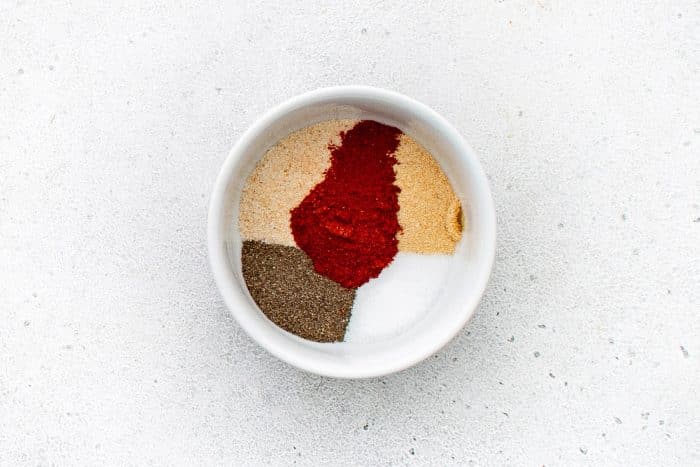 Dans un petit bol, mélangez le sel (1 cuillère à café), le poivre noir (1 cuillère à café), la poudre d'ail, la poudre d'oignon et le paprika fumé.