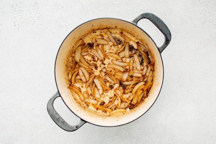 - Déglacerle pot, en grattant tous les morceaux bruns collés au fond.