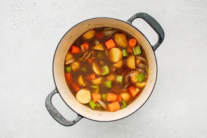 Versez 2 tasses de bouillon de bœuf en raclant le fond de la casserole avec une cuillère en bois pour soulever les morceaux dorés savoureux collés au fond (cela rehausse la sauce). Ajoutez les carottes, les pommes de terre, le céleri et le reste du sel (1 cuillère à café) et du poivre noir (½ cuillère à café).