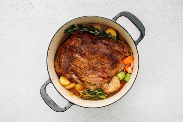 Remettez l'épaule de porc poêlée dans la cocotte, en la nichant dans le bouillon et les légumes. Poussez délicatement les brins de romarin frais et de thym dans le bouillon.